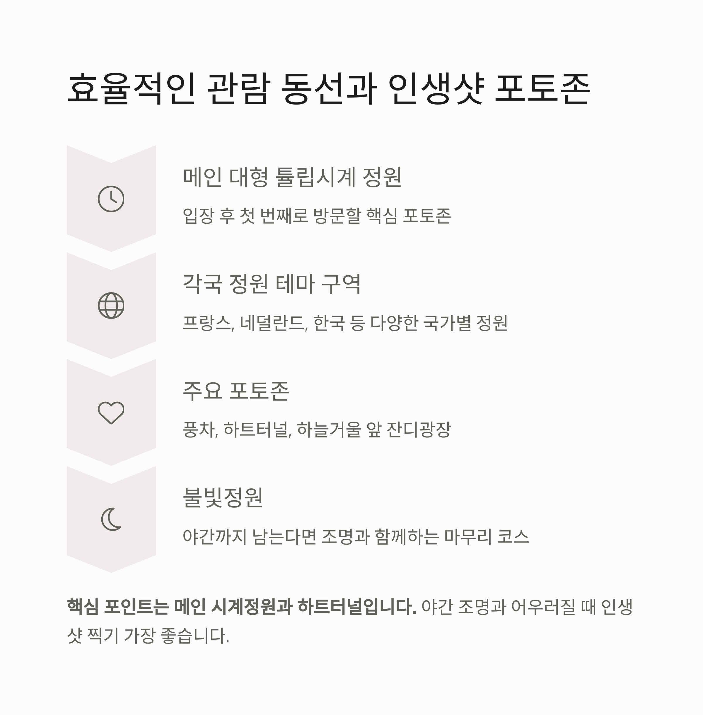 핵심 포인트는 메인 시계정원과 하트터널입니다.