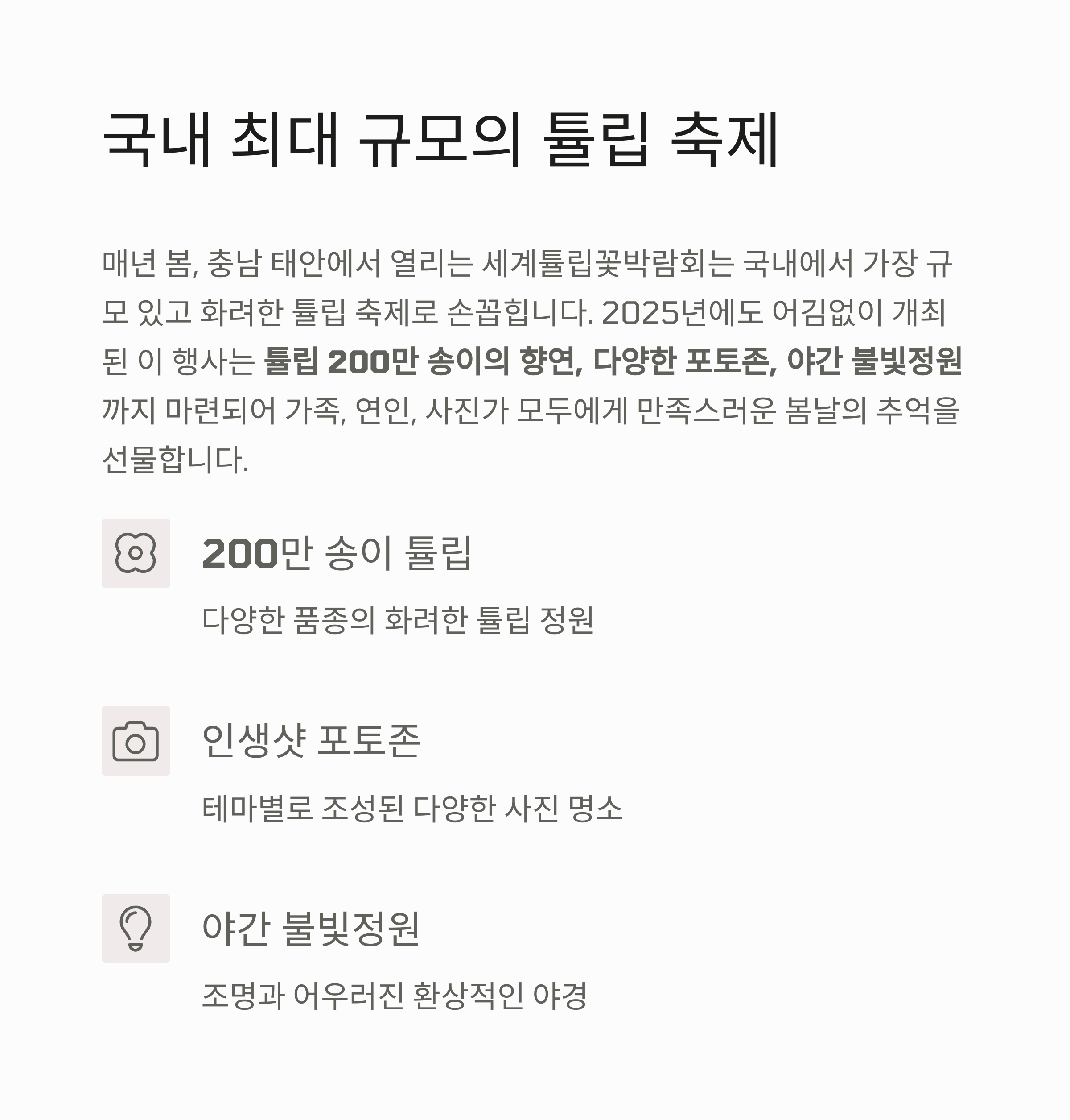 튤립 200만 송이의 향연, 다양한 포토존, 야간 불빛정원까지 마련되어