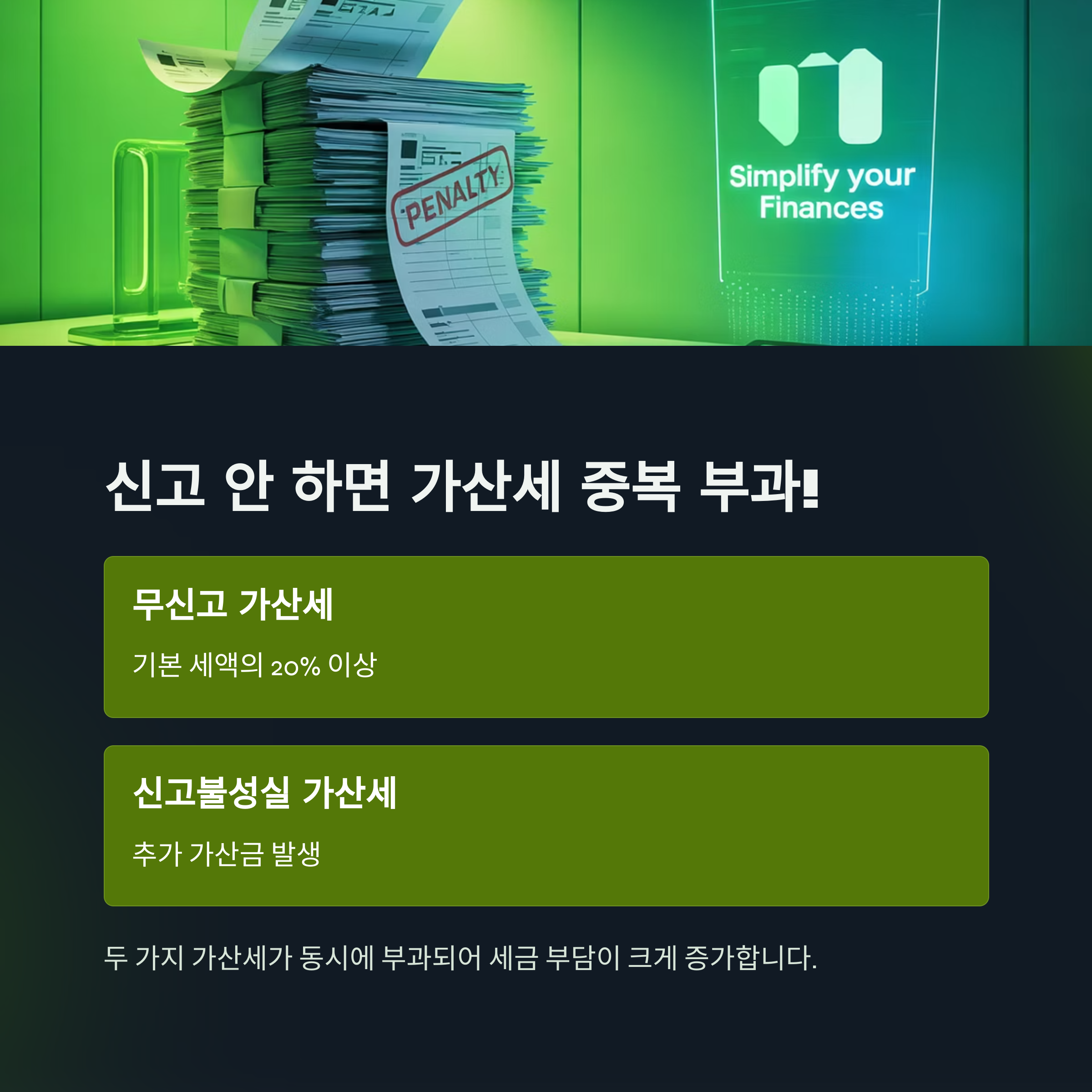 무신고 가산세는 20% 이상 부과될 수 있으며, 신고 지연 기간에 따라 추가 세금이 더 늘어날 수 있습니다.