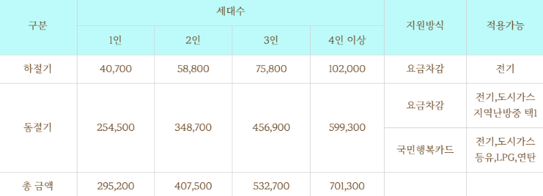 지원금액은 하절기와 동절기 두 개로 나뉘어 있습니다. 하절기 40,700원 ~ 102,000원 / 동절기 254,500원 ~ 599,300원을 지원해주며, 세대원 수에 따라서 차등 지원합니다.