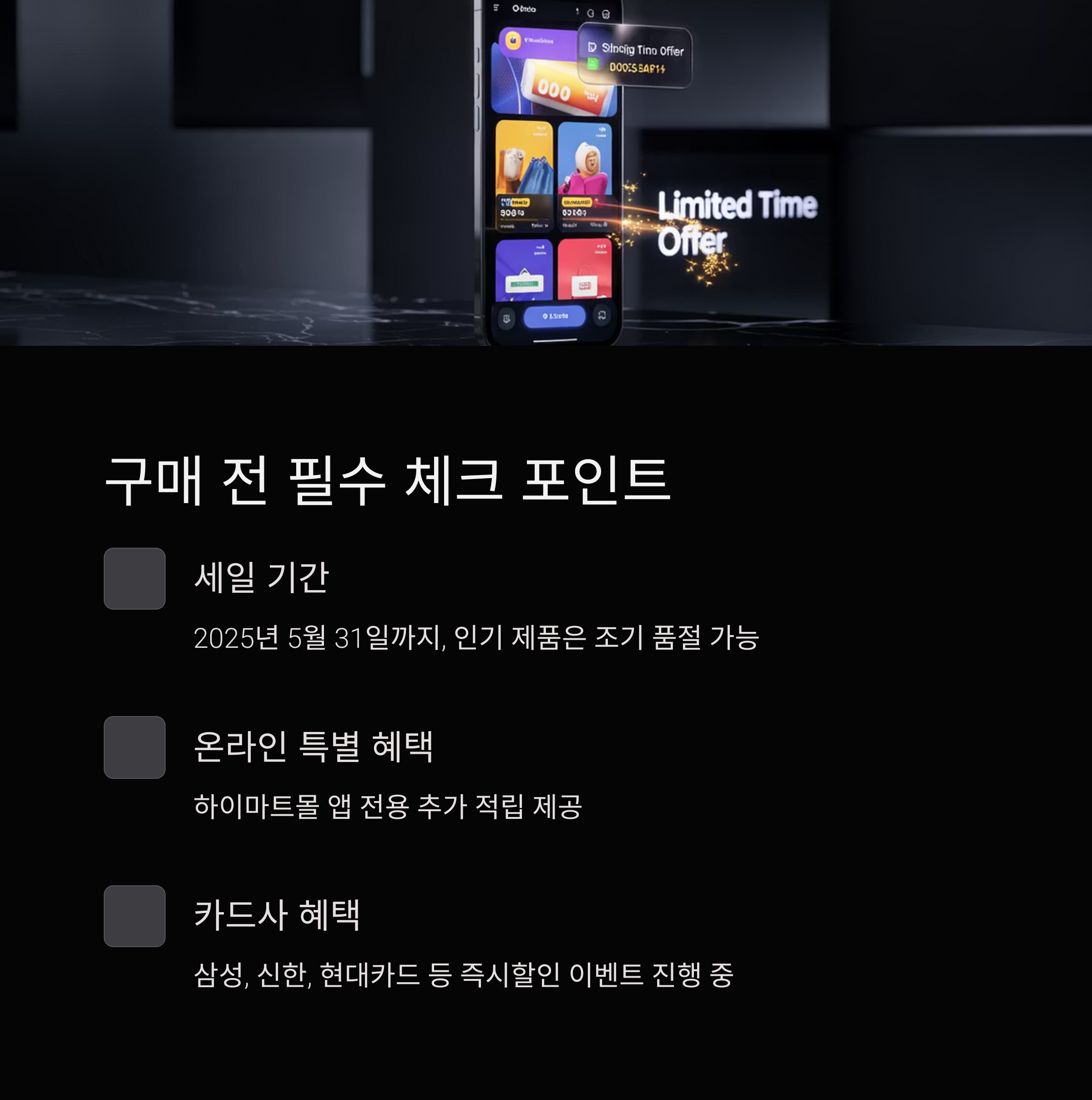 → 2025년 5월 31일까지입니다. 하지만 인기 제품은 조기 품절 가능성이 있습니다. - 온라인과 오프라인 혜택이 동일한가요?